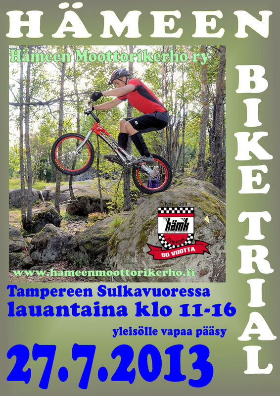 Biketrial SM osakilpailu ajettiin Sulkavuoressa 27.7.2013 Kilpailu ajettiin erittäin helteisessä säässä. Kilpailijoita oli kohtuullisen paljon 36 kuskia joista kaksi oli saapunut naapurimaastamme Ruotsista. Merkittävää oli myös että 11 kilpailijaa oli aloittelevien luokassa C-vapaassa. Antti Stenvallin kuvia Keskustelua kilpailuun liittyen täällä |