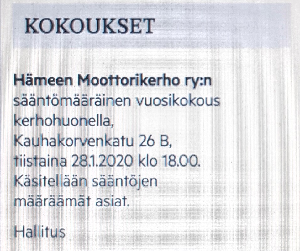 Sääntömääräinen vuosikokous pidettiin tiistaina 28.1.2020. Lisätty toimintakertomukset ja kokouksen pöytäkirja Lisätty toimintakertomukset ja kokouksen pöytäkirja Liitteet