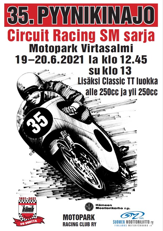 Circuit Racing SM sarja Motopark Virtasalmi Liitteenä käsiohjelma Käsiohjelmasta löytyy mm. aikataulu ja osallistujat Ratayhtiön mukaan liput tulevat myyntiin lippu.fi sivustolle ja niitä voi ostaa normaalisti myös radan lipunmyynnistä hintaan 20 euroa. Radalla noudatetaan covid19-ohjeita ja kasvomaksin käyttöä suositellaan. Viikonlopuksi on luvattu hellettä eli muista suojata itsesi ja juoda riittävästi vettä. Tervetuloa HäMk 90-vuotta juhlakilpailuun ! Liitteet