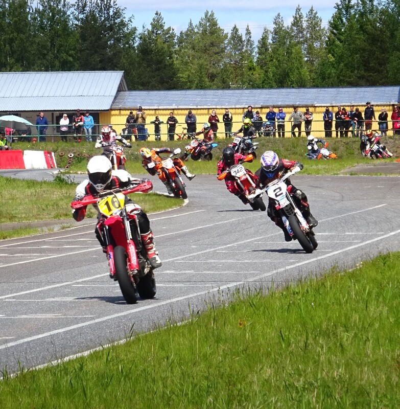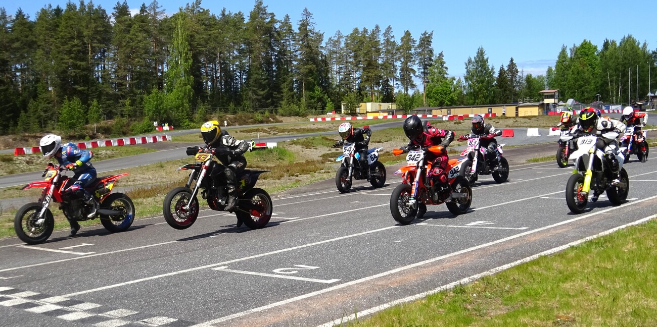 Hämeen Moottorikerho isännöi 10.6.2023 SM-Supermotoa Lappeenrannan Kimi Circuitilla, apunaan Lappeenrannan UA sekä MC-Eino. Kilpailu vietiin läpi mainiossa auringonpaisteessa ja yleisökin oli löytänyt paikalle. Hyvinkään Eemeli Åstedt vei S1-luokan molemmat lähdöt selvästi nimiinsä. Viron Eero Madisson kaasutti samoin toiseksi molemmissa erissä, vaikkakin poistui kakkoserässä kerran kauas radalta ja vielä kaatui kerran. Ykköserää johtanut Ossi Rantala taipui lopulta kolmanneksi ja kakkoserän pilasi rengasrikko. Toisen erän kolmoseksi nousi Niko Heikkala. Hyvinkäällä loistaneen Antti Soitialan päivä oli mollivoittoinen. Ensin kaatuminen ja toiseen erään pyörä ei suostunut käynnistymään, tuloksena siis puhdas nolla. S4-luokkaa hallitsi Vertti Takala, vanavedessään Niko Heikkala. Seuraavaksi korkeimmat tasapisteet keräsivät Valtteri Koponen ja Juho Mähönen. S4-junioreissa nähtiin tiukat taistelut voitoista. Imatran Jerry Miikki laittoi Valter Piccardin ahtaalle, mutta Valter oli lopulta ensimmäisenä ruutulipulla molemmissa erissä. Seuraavina tasapistein Niclas Ahlqvist ja Tuomas Soininen. Minisupermoto Stock Suomen cupissa ajettiin kaksi tasaista lähtöä, järjestys molemmissa 1. Tatu Makkonen 2. Joel Dufvelin ja 3. Marko Vatanen. Päivän päätteeksi ajettiin vielä 4-tunnin mopoendurance, cup-sarjan toinen osakilpailu. Jostain syystä mukana vain kahdeksan joukkuetta. Pisimmän matkan ehti ajaa Low Budget Racing, toisena Team Vikkulla ja kolmantena Tampereen Konepyörä. Iso kiitos talkooporukalle kilpailun sujuvasta järjestelystä.
