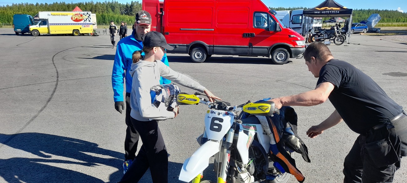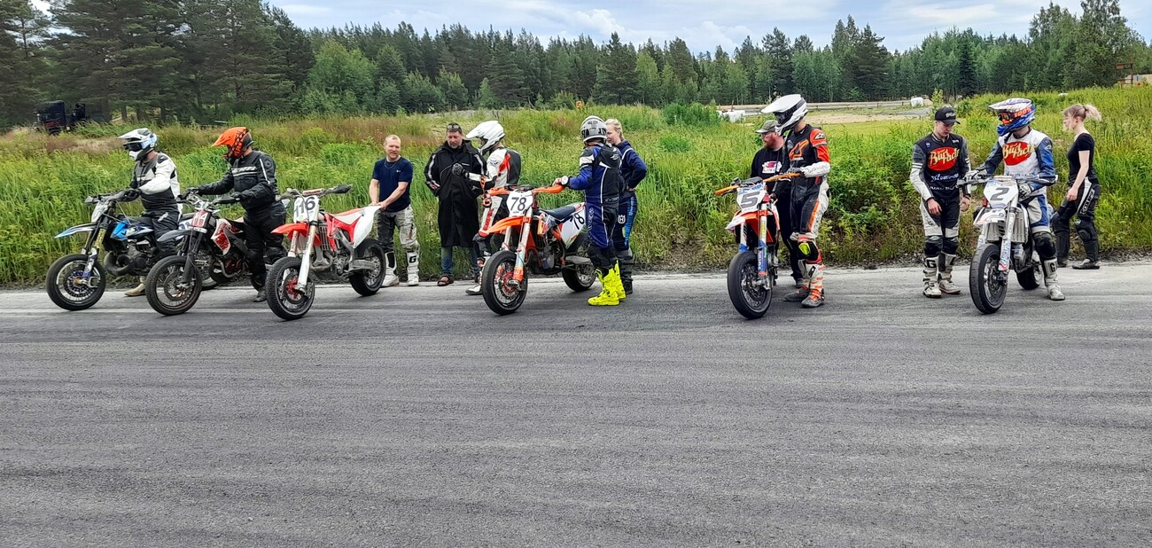 HÄMEEN SUPERMOTO SM KISATTIIN KAANAASSA 15.-16.6.2024 Supermoton SM-sarjan toinen osakilpailu ajettiin 15.-16.6.24 Tampereen Kaanaassa Hämeen Moottorikerhon isännöimänä. Lämmin ja poutainen keli tarjosi tapahtumalle hyvät puitteet. Soraosuuden näkyvyyttä haittasi pöly, kun kastelua ei saatu järjestettyä yrityksestä huolimatta. S1-luokan hallintaa jatkoi viime vuoden tapaan Hyvinkään Eemeli Åstedt voittamalla molemmat erät. Eemeli johtaa myös sarjaa puhtaalla voittosarjalla. Antti Soitiala tarjosi etenkin toisessa erässä kovan vastuksen käyden jo hetken kärjessä. Tuloksena sijat 2 ja 3. Antin kaaduttua korjasi kakkoserän hopeasijan Ossi Rantala. Viron Aksel Pärtelpoeg nousi ykköserän kolmannelle pallille. Kolmessa muussa luokassa on ykköspaikan saavuttanut toistaiseksi aina sama taituri. S4-luokkaa hallitsee Niko Heikkala, S4-junioreita Jerry Miikki ja S2-luokassa voittamaton on ollut Toni Paakkinen. Kaikilla neljästä erävoitosta puhtaat 100 pistettä. Tulokset löytyvät osoitteesta tulosarkisto.fi. Sunnuntaina testattiin uuden 50 ja 100 kierroksen joukkuekisan toimivuutta. Ideana on luoda matalan kynnyksen kilpailu melko vapailla säännöillä ja kalustolla. Nyt mukana oli sekä supermoto- että mopojoukkueita kahden hengen tiimeissä. Juniorit ajavat 50 kierrosta ja aikuiset 100. Historiaakin tehtiin, kun paremmin endurosta ja crosscountrysta tuttu Justiina Koivisto osallistui ensimmäisenä naisena Suomessa supermoto kilpailuun. Lisää naisenergiaa toi mopotiimissä kilpaillut Minka Pummila sekä junioreissa ajanut Iina Suikkanen. Ajatusta uudessa formaatissa on, ja toivottavasti seuraavalla kerralla viivalla on vähintään tuplasti joukkueita. Iso kiitos kaikille talkoolaisille onnistuneesta tapahtumasta. Teksti ja kuvat: Jari Heinilä