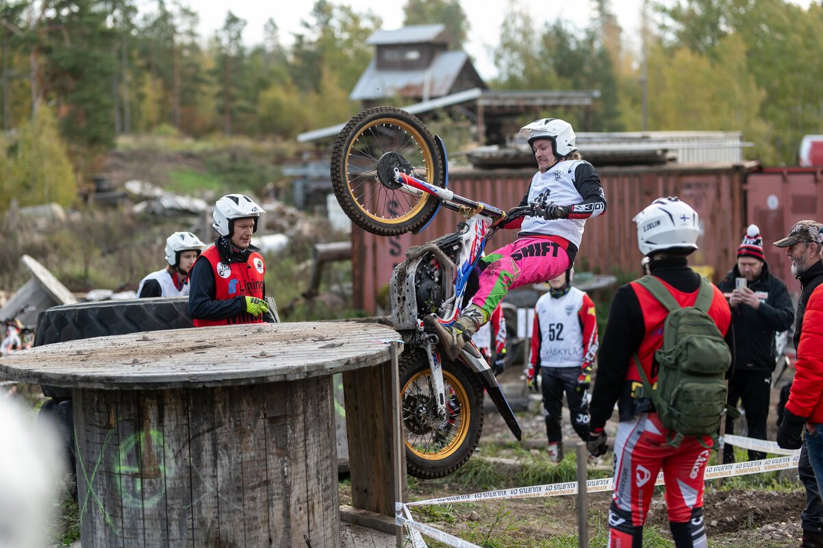 HäMK:n kuskit ajoivat hyvin kauden viimeisissä kisoissa Puujaalla Trialin Suomen Mestaruudet ratkottiin PuujaassaHämeen Moottorikerhon kuljettajat menestyivät hienosti Kilpailun kulkuKilpailussa oli 10 jaksoa, joista 8 oli vaihtelevissa maastoissa ja 2 oli x-trial jaksoa. Siirtymät kulkivat enduro-polkuja pitkin ja niiden pituus oli noin 5 km. Kilpailu oli kaksipäiväinen: lauantaina ajettiin sarjan viides osakilpailu, joka ratkaisi henkilökohtaisen mestaruuden ja sunnuntaina oli joukkuekilpailu. Joukkuekilpailun mestaruudet ratkesivat yhden kilpailun perusteella. SääolosuhteetLauantaina sää oli aurinkoinen ja lämpötila vaihteli aamun 5 asteesta 15 asteeseen. Vasten aurinkoa ajaminen haittasi näkyvyyttä, kun syysaurinko paistaa matalalta. Sunnuntaina sää oli poutapilvinen ja lämpötila vaihteli aamun 8 asteesta 12 asteeseen. Henkilökohtaiset kilpailutTR1-luokassa Samuel Jääskeläinen (Pirkkala) ajoi lauantain kisassa kolmanneksi, joka varmisti SM-pronssin sarjassa. Kilpailun alku oli haastava kaikille kuskeille, joka näkyi kierroksen virhepisteissä. Uudet jaksopaikat ja märkä maa haastoivat kuskit äärimmilleen. Ekan kierroksen jälkeen Samuel oli toisena. "Ei riittänyt, kilpakumppanit ajoivat paremmin toisen ja kolmannen kierroksen ja pronssiin oli tyytyminen tällä kaudella", Samuel kommentoi kilpailun tulosta. Vilkku Selin (Tampere) sijoittui neljänneksi. Vilkku ajoi tasaisen kilpailun, jossa toinen kierros oli paras. Nolla jaksoja merkattiin jaksokortille ja ajo näytti hyvältä. SM-sarjassa Vilkku sijoittui neljänneksi. Tämä oli uran paras sijoitus SM-sarjassa. TR3-luokassa Eelis Jääskeläinen (Pirkkala) sijoittui kolmanneksi. Eeliksellä oli hyviä ajosuorituksia, pitkillä ja vaativilla jaksoilla ja yritystä riitti koko päiväksi. Sarjassa hän oli toinen. TR4-luokassa Teemu Lepistö ajoi neljänneksi. Teemu keräsi saman määrän virhepisteitä kuin kolmanneksi ajanut, joten virheittä ajettujen jaksojen määrä pudotti sijoituksen neljänneksi. Vajaan kauden tänä vuonna ajanut Teemu oli sarjassa 12. TR5J-luokassa Eino Marttila (Nokia) sijoittui toiseksi. Sarjassa hän oli kolmas. Eino ajoi hienon kisan. Viimeinen kierros sujui kilpailun pienimmällä kierrospisteillä, joita kertyi yhteensä vain 12 vp. Toisen kierroksen pari maksimivirhettä pudotti Einon tänään voittotaistelusta. "Reenit jatkuvat ensi viikolla. Palataan ensi kaudella kovempana kuskia takaisin jaksoille.", Eino kommentoi. Nicolas Leppiniemi (Nokia) sijoittui viidenneksi. Sarjassa hän oli viides. Nicolas vaihtoi luokkaa kesken kauden hakien näin lisää haasteita kilpailuihin. Oppia on kilpailuista tullut ja reeni-intoa riittää Einon kanssa. JoukkuekilpailutSunnuntaina ajettiin joukkuekilpailut. Joukkuekilpailuissa oli tarjolla kolme reittivaihtoehtoa ja reitti kierrettiin kahteen kertaan. Ratamestari määräsi mitä reittiä joukkueiden piti noudattaa jaksolla. Jaksopaikat ja reitti oli sama kuin lauantaina. Helpoimman reitin suorittivat juniori- ja harrastekilpaijat parikilpailuna. Hämeen Moottorikerhoa tässä luokassa edustivat Eino Marttila ja Nicolas Leppiniemi. He sijoittuivat toiseksi. Keskimmäisessä luokassa ajoivat edistyneemmät juniorit ja taitavimmat harrastajat. Eelis Jääskeläinen, Teemu Lepistö ja Manu Ruotsalainen edustivat tässä luokassa. He sijoittuivat kolmanneksi. Suomen Mestaruudesta ajettiin vaikeimmassa luokassa ja siinä kerhoa edustamassa oli Samuel Jääskeläinen, Janne Karjalainen ja Vilkku Selin. He sijoittuivat toiseksi. Tulokset: https://tulosarkisto.fi/races/view/767
